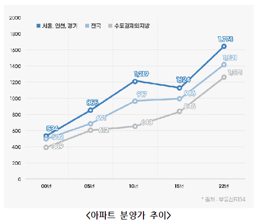 지역별로 수도권이 2021년 1476만원에서 2022년 1774만원으로 20.1% 상승했으며, 지방도 같은 기간 1189만원에서 1371만원으로 15.3% 뛰었다.