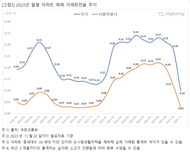 아파트 거래 회전율은 아파트 재고 세대수(준공 후 기존 아파트, 총세대수 30세대 미만단지 제외) 대비 실제 매매 거래된 해당 아파트 거래량의 비율을 뜻한다. 해당 수치가 과거보다 낮아진다는 것은 거래 빈도가 줄어드는 것을 의미하며, 그만큼 주택 구입수요가 줄어 매매시장의 활력이 저하됨을 의미한다.