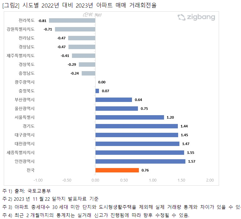 반면 지난해에 비해 2023년 아파트 매매 거래 회전율이 회복된 지역도 있다. 전국 17개 지자체 중 지난해보다 거래 회전율이 개선된 지역은 총 9곳이다. 인천광역시는 올해 3.23%로 지난해 1.66%보다 1.57%P 개선됐다. 송도신도시 내 저가 매입 수요와 검단신도시 첫 입주가 맞물리며 거래개선에 도움을 줬다.