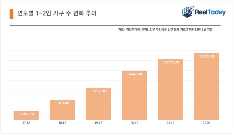 이러한 소형 아파트의 높은 인기는 1~2인가구 증가세 덕분이다. 1~2인 가구가 지속적으로 증가하면서, 부동산 시장의 주요 수요층으로 잡은 것이다. 실제로, 행정안전부 주민등록 인구 통계 자료를 살펴보면, 1~2인 가구수는 2017년1,246만131가구에서 2022년 6월 1,537만3,533가구로 5년새 23%가 증가했다.