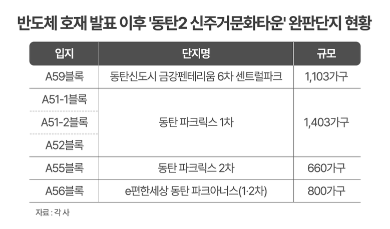 또 ‘e편한세상 동탄 파크아너스(A56블록)’는 정부 발표 전 공급된 1회차 437가구가 0.87대 1의 경쟁률로 청약 흥행에 실패했지만, 반도체 호재가 발표되면서 완판에 성공했다.