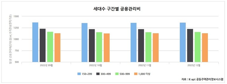 실제로 K-apt 공동주택관리정보시스템에 따르면, 세대수구간별 공용관리비는 150~299세대가 1,366원, 300~499세대가 1,228원, 500~999세대가 1,160원, 1,000세대 이상이 1,136원인 것으로 나타났다. 300세대 미만과 1,000세대 차이가 230원으로 주거 전용 면적 84㎡(구 30평)로 환산해 보면 같은 면적 내에서 2만원 가까이 차이가 나는 것이다. (11만 4,744원 - 9만 5,424원 = 1만 9,320원)