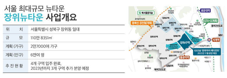 서울 성북구 장위동 일대 조성되는 장위뉴타운(장위재정비촉진지구)은 총 면적 110만8351㎡에 15개 구역으로 나눠 정비사업이 진행되고 있다. 계획된 상주 가구 수만 2만7000여 가구에 달하고, 6만여 명이 넘는 인구가 거주하게 될 예정이다.