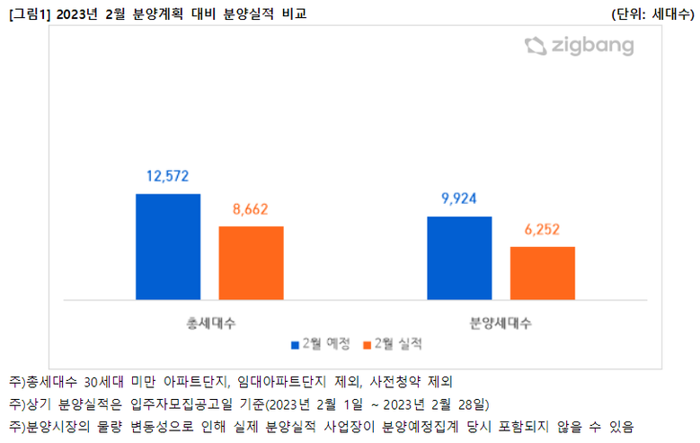 지난 2월 초에 조사(2월 2일)한 2월 분양예정단지는 16개 단지, 총 1만2,572세대, 일반분양 9,924세대였다. 이를 재조사한 결과 실제 분양이 이루어진 단지는 11개 단지, 총 8,662세대(공급실적률 69%), 일반분양 6,252세대(공급실적률 63%)가 분양됐다.