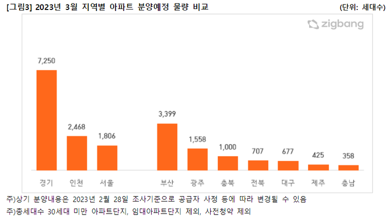 3월 전국에서 공급하는 1만9,648세대 중 1만1,524세대가 수도권에서 분양 준비 중이다. 경기도가 7,250세대로 가장 많은 공급이 계획되어 있다. 지방에서는 8,124세대의 분양이 계획되어 있으며, 부산시에서 3,399세대로 가장 많은 공급이 이루어질 전망이다.