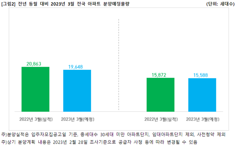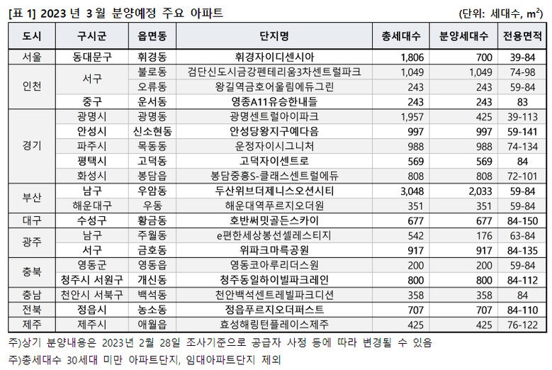 2023년 3월에는 26개 단지, 총세대수 1만9,648세대 중 1만5,588세대가 일반분양을 준비하고 있다. 2022년 동월 물량과 비교해 총세대수는 1,215세대(6% 감소), 일반분양은 284세대(2% 감소)가 감소할 것으로 조사됐다.