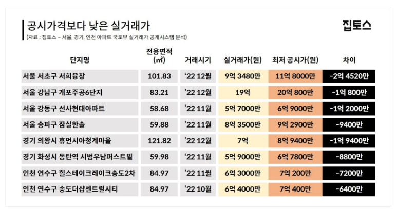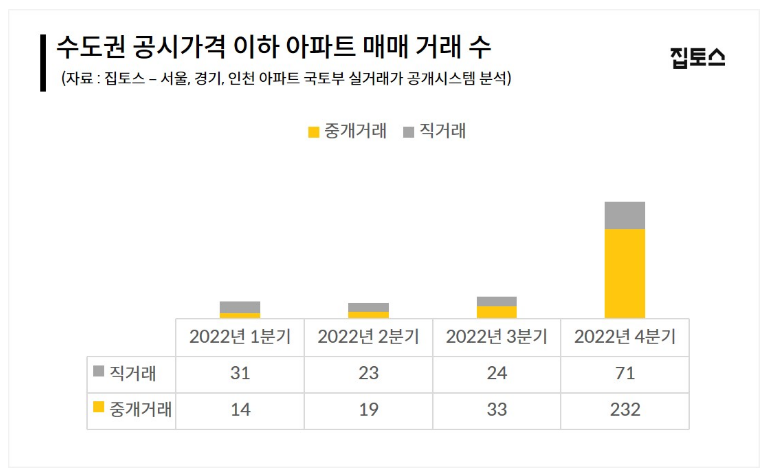 27일 부동산 중개업체 집토스가 서울과 경기, 인천 지역의 국토교통부 아파트 매매 실거래가를 분석한 결과, 22년 4분기 거래 중 303건이 동일 면적 최저 공시가격 이하로 거래된 것으로 집계됐다. 동년 전 분기별 평균치인 48건보다 6배 이상 급증한 수치다. 증여 등으로 시세보다 낮게 거래되는 경우가 많은 직거래를 제외한 중개거래만으로도 232건의 아파트 거래가 공시가격 이하로 거래됐다.