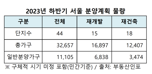 부동산시장 분석업체 부동산인포에 따르면 하반기 서울에서는 총 44곳, 3만2,657가구가 분양에 나설 예정이다(민간 아파트기준. 임대포함). 이중 일반분양가구는 1만1,105가구다.