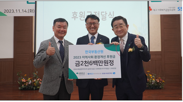 | ▲지난 14일 대구종합사회복지관에서 개최된'안심사랑 벽화·정원' 후원금 전달 사진(왼쪽부터 김근용 대구종합사회복지관장, 장대문 한국부동산원 ESG전략실장, 이홍렬 초록우산 홍보대사)<사진제공=한국부동산원> |