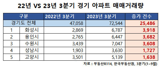 경기도에서 올해 3분기(1~9월)에 거래된 아파트 매매거래량은 7만2,544건으로 작년 동기(4만7,058건) 대비 154.16% 늘어났다. 증가 건수가 가장 많은 지역은 화성시로 작년 2,869건에서 6,787건으로 3,918건이 늘었다. 이어 용인시(▲3,682건), 수원시(▲3,608건), 성남시(▲1,727건), 고양시(▲1,638건) 지역 순으로 거래 건수 증가가 많았다. (자료 : 부동산r114, 한국부동산원)