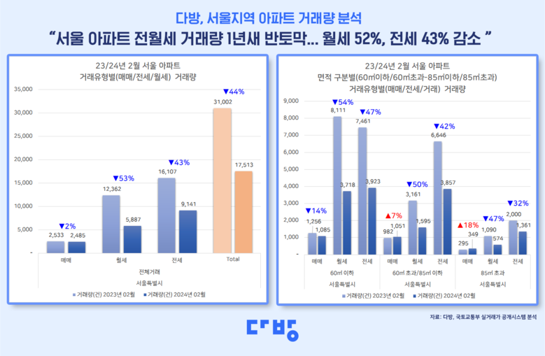 국내 최대 부동산 정보 플랫폼 ‘다방’을 운영하는 스테이션3는 국토부 실거래가를 바탕으로 2023년 2월부터 2024년 2월까지 서울 지역 아파트 거래량을 분석한 결과, 지난 2월 기준 매매·전세·월세 거래를 모두 포함한 서울 지역 아파트 거래량은 3만 1002건으로 나타났다고 28일 밝혔다.