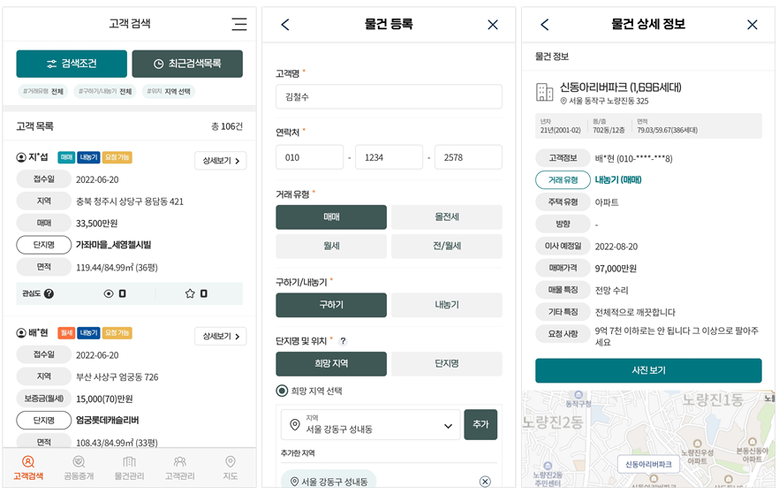‘이집어때’는 이용자 특성에 최적화된 서비스를 제공하고자 고객을 위한 기능 외에, 중개사 회원 가입 시 별도의 기능을 활용할 수 있도록 구성되어있다.