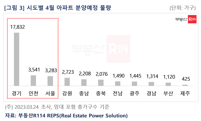 시도별로 4월 분양예정 물량은 △경기 1만7,832가구 △인천 3,541가구 △서울 3,283가구 △강원 2,723가구 △충남 2,208가구 순으로 많다. 경기는 광명, 의왕의 재개발 대단지를 포함한 총 17곳에서, 인천은 서구에서만 4개 단지가 분양을 앞두고 있다. 특별공급 및 추첨제 확대, 대출 완화 등으로 청약 문턱이 낮아진 서울에서는 휘경자이디센시아, 서대문센트럴아이파크 등 재개발 사업지들이 공급에 나선다. 반면 미분양 리스크가 커진 지방은 대구, 대전, 세종, 울산, 전북, 경북 등 6개 지역에서 분양계획이 전무하다.