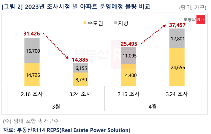 부동산R114(www.r114.com)에 따르면 올해 4월에는 전국 42개 단지, 총 3만7,457가구가 분양에 나설 예정이다. 3월 예정물량의 일부가 4월로 연기된 데다, 봄 성수기로 분양이 몰린 영향이다. 3월 24일 조사 기준, 4월 분양예정 물량은 2월 16일 조사 때보다 1.5배(2만5,495가구→3만7,457가구) 늘었다. 권역별로 수도권이 1만256가구(1만4,400가구→2만4,656가구), 지방은 1,706가구(1만1,095가구→1만2,801가구) 늘었다.
