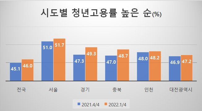올해 1/4분기 전국 청년(15~29세)고용률은 46%인 가운데 서울이 51.7%로 가장 높았고, 경기도는 49.3%로 서울 다음으로 높았다.