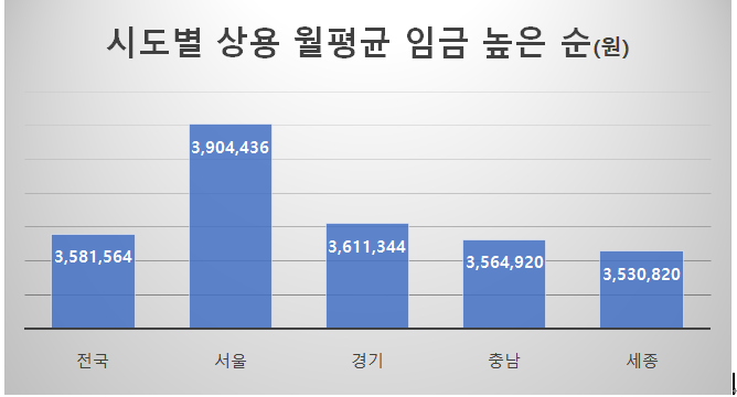 시도별로 상용 월평균 임금이 가장 높은 곳은 서울로 390만4436원이며 전년도 대비 4.2%가 올랐다. 서울 다음으로는 경기도로 361만1344원이고 전년도 대비 4.2%가 올랐다. 다음으로 충남이 356만4920원, 세종시 353만820원으로 나타났다. 상용 월평균 임금이 가장 낮은 곳은 제주도로 290만6566원으로 경기도와 무려 70만4778원이 차이 난다.