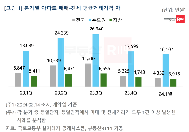 부동산R114가 국토교통부 실거래가 자료를 통해 분기별로 같은 아파트(동일단지 및 면적)에서 매매와 전세계약이 모두 1건 이상 체결된 사례를 찾아, 실거래 최고가의 격차를 확인했다. 그 결과, 전국 아파트 매매와 전세간 거래가 격차는 2023년 1분기 6,847만원에서 3분기 1억1,587만원으로 확대됐다가 4분기 들어 5,325만원, 2024년 1월 4,332만원으로 다시 축소됐다. 지난해 4분기 기준, 지역별 매매와 전세간 가격 차는 서울이 4억6,592만원으로 가장 큰 반면 경북(427만원), 전북(922만원), 충북(1,541만원) 등은 작았다.