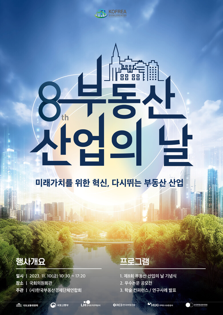 사단법인 한국부동산경제단체연합회가 주최하고 국회 국토교통위원회, 국토교토부, 한국토지주택공사(LH), 주택도시보증공사(HUG), 한국부동산원, (사)한국부동산분석학회 등이 후원하는 제8회 부동산산업의날 행사가 오는 11월10일 국회에서 개최된다.