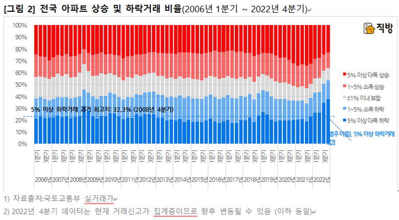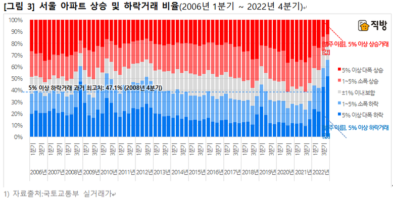 2022년 4분기 현재 전국 아파트의 직전대비 5% 이상 대폭 하락거래의 비율은 37.7%, 서울은 51.6%로 집계되고 있다. 서울의 경우 실거래 신고제도가 도입 된 이후 처음으로 대폭 하락거래가 전체 거래의 과반을 돌파한 것이며, 오차범위 ±1%를 제외한 전체 하락거래는 총 거래량의 2/3에 달한다. 전국과 서울 모두 5% 이상 대폭 하락거래의 과거 최고치는 금융위기의 여파가 있었던 2008년 4분기였는데, 2022년 4분기 현재 과거 최고치보다도 4-5%p가량 높은 역대 최고 수준을 기록하고 있다.