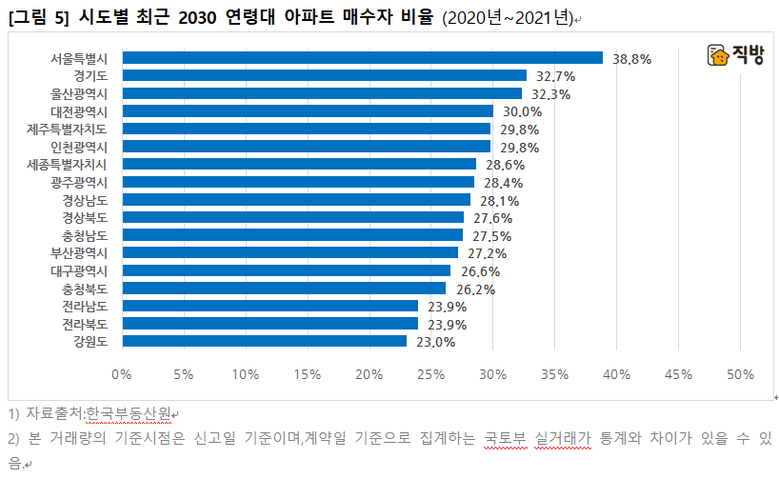 2022년 3~4분기 현재, 수도권과 세종시 및 전국 광역시 지역에서는 ±1% 오차범위를 넘어선 하락거래가 50% 이상을 차지하고 있다. 반면 경기를 제외한 8개 도지역에서는 상승거래와 하락거래가 상대적으로 비슷한 수준을 보인다. 특히 수도권, 대전-세종 및 대구에서 하락거래의 비율이 높았는데, 수도권과 대전-세종은 최근2030 세대의 매수세가 강했던 지역이고 청년층은 주택 매수 시 상대적으로 자기자산보다 대출의 비중이 높다는 점을 고려하면 최근 급격한 금리인상의 영향이 컸을 것으로 추정된다. 또한 대구의 경우 청년층의 매수세는 상대적으로 강하지 않았으나 수요 대비 과도한 아파트 공급으로 미분양 단지가 속출하는 등 침체 분위기가 완연한 지역이라는 점으로 인해 나타난 현상으로 해석된다.
