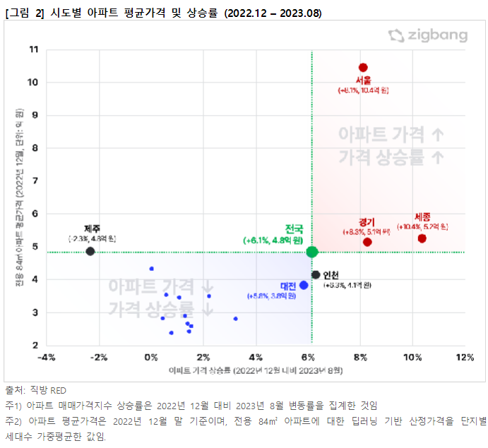 2023년 현재 전국 아파트 가격격차가 확대된 것은 지역별 아파트 가격 반등 속도가 다르게 나타난 것의 영향으로 보인다. 격차가 다시 커지기 시작한 2022년 12월의 시도별 아파트 평균가격과 2022년 12월부터 2023년 8월까지의 시도별 가격 상승률을 비교하였다. 분석 결과 전국 평균(+6.1%)보다 더 빠르게 가격이 상승한 곳은 세종(+10.4%), 경기(+8.3%), 서울(+8.1%), 인천(+6.3%)이었으며 그 중 서울, 세종, 경기의 아파트 평균가격(2022년 12월)은 전용 84㎡ 기준 각각 10.4억 원, 5.2억 원, 5.1억 원으로 전국 평균인 4.8억 원보다 높았다. 반면 대전을 포함한 다른 대부분의 시도들은 아파트 평균가격이 상대적으로 낮고 상승률도 낮았다. 전체적으로 인천과 제주를 제외한 대부분 지역에서 가격이 상대적으로 비싼 곳이 상승률도 더 높았고, 반대로 가격이 저렴한 곳은 상승률이 낮다는 패턴을 보인 것이다.
