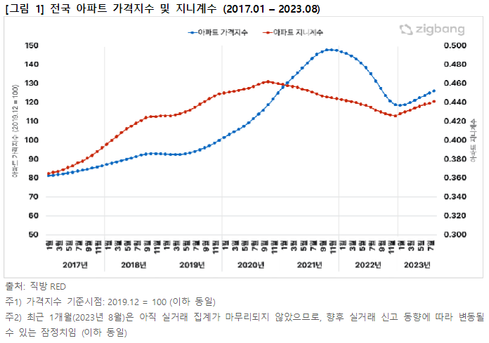 2023년 현재 아파트 시장의 가격 반등과 함께 수도권 고가 아파트를 주요 타겟으로 설정되었던 규제가 해제되어 격차가 더욱 확대될 수 있다는 우려가 나오고 있다. 이에 ㈜직방이 불평등의 정도를 정량화하는 '지니계수'를 주택 시장에 도입하여 전국 아파트 가격격차의 동향을 살펴보았다.