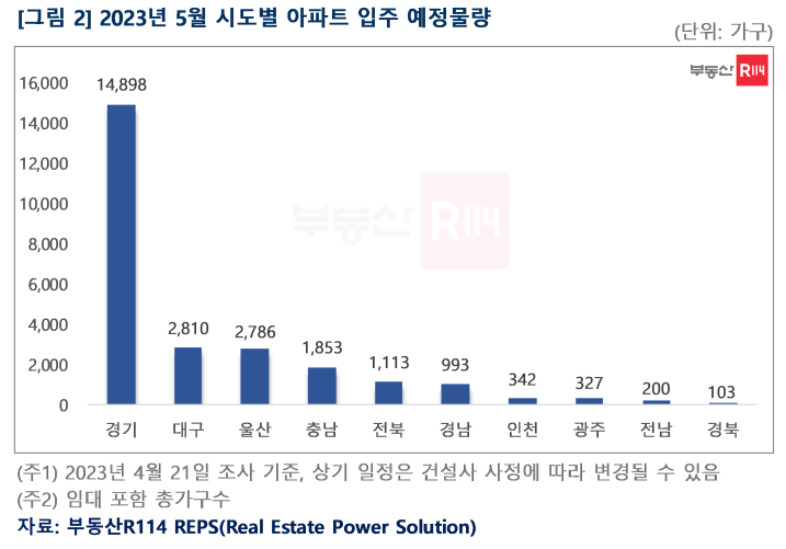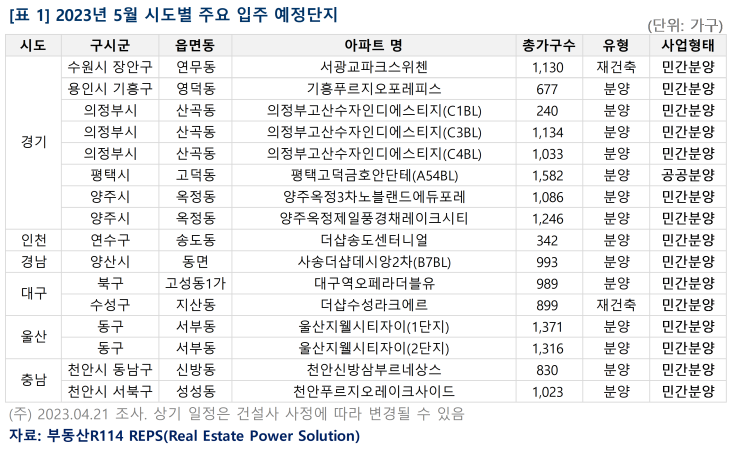 지방은 대구에서 6개 단지, 총 2,810가구가 입주 예정이며, 이 중 절반 이상인 1,549가구가 북구에서 공급된다. 울산과 충남에서는 울산 동구 서부동 ‘울산지웰시티자이(2,687가구)’, 충남 천안시 성성동 ‘천안푸르지오레이크사이드(1,023가구)’ 등 대단지 입주가 이어진다.