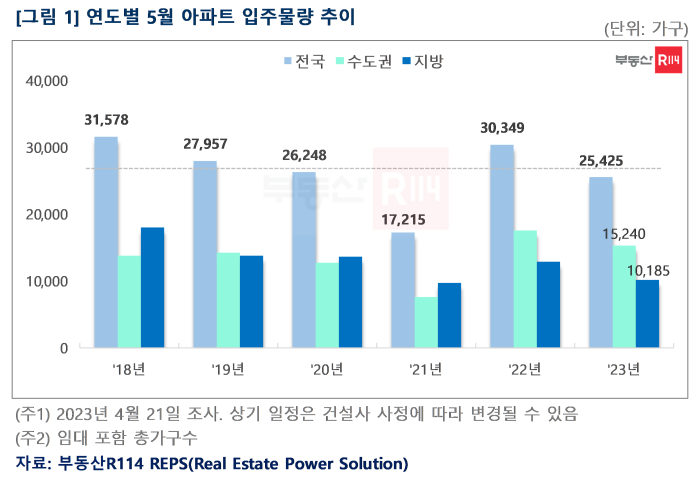 5월 입주를 진행하는 지역은 전국 17개 시도 중 10곳에 불과하다. 입주 예정단지가 특정 지역에 몰리면서 지역간 물량 격차가 확대되는 양상이다. 부동산R114(www.r114.com)에 따르면 전국 아파트 입주 예정물량은 40개 단지, 총 2만5,425가구(임대 포함)로 집계됐다. 공급량은 지난 달(2만3,262가구) 대비 2,163가구 증가했으나, 최근 5년간(2018~2022년) 5월 평균 입주물량인 2만6,669가구 보다는 밑도는 수준을 나타냈다.