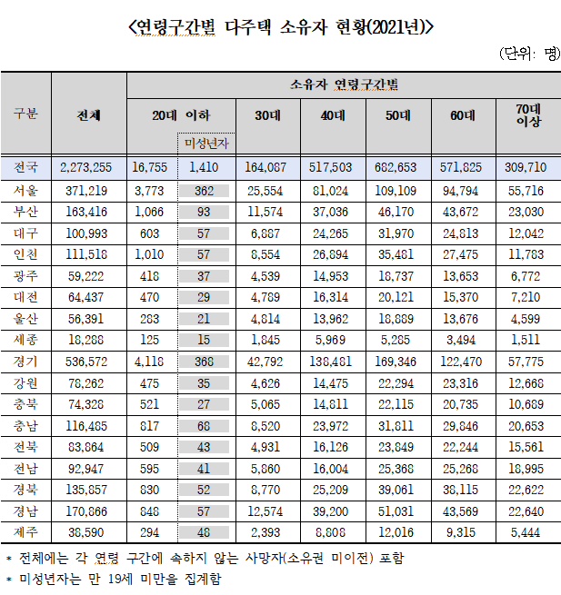 자산 증여의 증가와 함께, 20-30 다주택자의 수 또한 18만명을 넘은 것으로 드러났다. 통계청이 한병도 의원실에 제출한 ‘거주지역별 연령대별 2건 이상 주택소유자수 현황’ 자료에 따르면, 지난 2021년을 기준으로 2채 이상의 주택을 보유한 20대는 16,755명, 30대는 164,087명에 달했다.