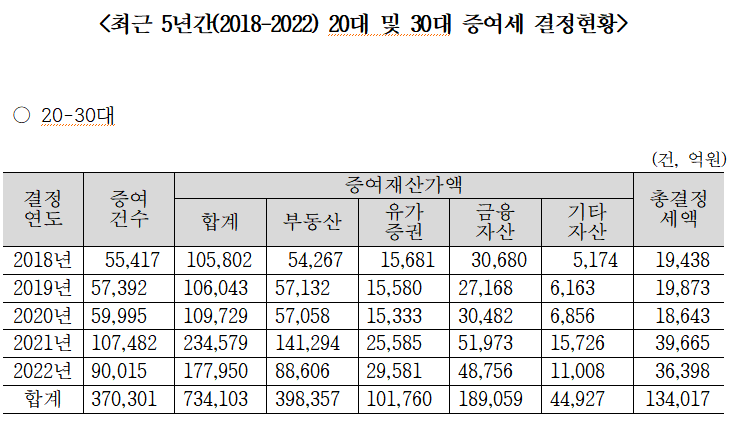 지난 5년간(2018-2022) 20대 증여는 증여세결정건수 기준 15만 3,654건, 재산가액으로는 27조 20억원에 달했고, 30대 증여는 21만 6,647건, 재산가액으로는 46조 4,082억원에 달했다.