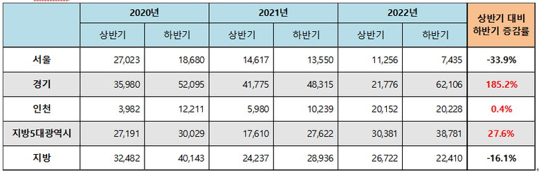 지역별로 2022년 하반기에 경기, 지방5대 광역시는 상반기에 비해 많은 입주물량이 대기중이다. 이런 영향으로 해당 지역 거주자 중 2022년 하반기 전세가격이 ‘하락’할 것으로 전망한 응답자가 많았던 것으로 분석된다.