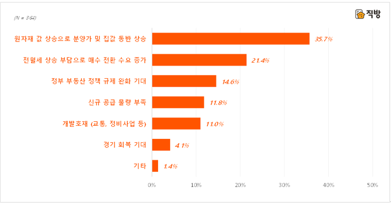 반면, 2022년 주택 매매가격이 상승할 것으로 예상한 응답자의 이유는 ‘원자재 값 상승으로 분양가 및 집값 동반 상승’이 35.7%로 가장 많았다. 이어 △전월세 상승 부담으로 매수 전환 수요 증가(21.4%) △정부 부동산 정책 규제 완화 기대(14.6%) △신규 공급 물량 부족(11.8%) △교통, 정비사업 등 개발호재(11.0%) 등 순으로 나타났다.