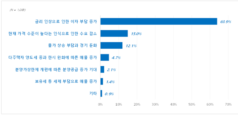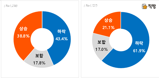 2022년 하반기 거주지역의 주택 매매가격을 어떻게 예상하냐는 질문에 전체 응답자(1,727명)중 61.9%가 ‘하락’할 것으로 전망했다. 이는 2021년 말에 조사한 2022년 주택 매매가격 ‘하락’(43.4%) 응답 비율보다 더 커진 결과이다.