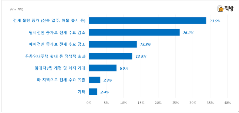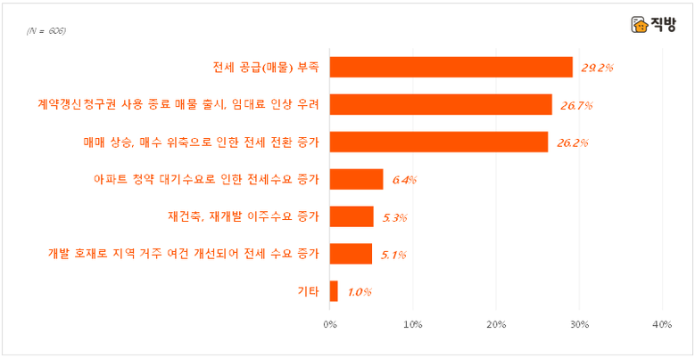 반면, 전세가격이 오른다고 답한 응답자의 상승 이유로는 ‘전세 공급(매물)부족’이 29.2%로 많이 응답됐다. 이어 △계약갱신청구권 사용 종료 매물 출시, 임대료 인상 우려(26.7%) △매매 상승,매수 위축으로 인한 전세 전환 증가(26.2%) 등의 순으로 나타났다.