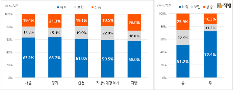 주택보유 여부에 따라서는 유주택자, 무주택자 모두 ‘하락’ 전망 의견이 과반수로 많았으나 무주택자의 ‘하락’(72.4%)전망 의견이 더 많았다.