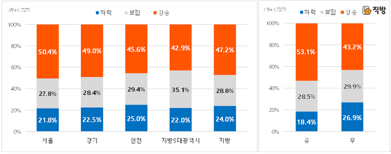 지역별로는 전국 모든 지역에서 ‘상승’ 전망 의견이 많은 가운데 서울(50.4%)과 경기(49.0%) 지역이 타지역에 비해 상대적으로 높은 응답 비율을 보였다. 주택보유 여부별로는 유주택자, 무주택자 모두 ‘상승’ 전망이 많은 가운데 유주택군의 ‘상승’ 예상 비율이 더 높게 나타났다.