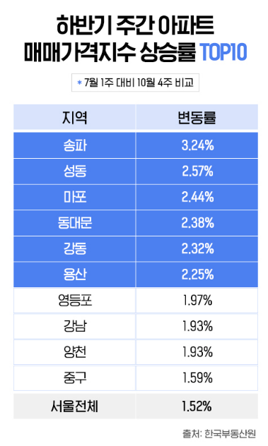 부동산시장 분석업체 부동산인포가 한국부동산원 주간 아파트매매가격지수 하반기(7월 1주~10월 4주) 상승률을 분석한 결과 2% 이상 상승률을 기록한 곳은 25개 자치구 가운데 6개 차지구로 확인됐다.