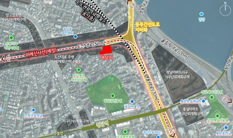 프리마호텔 부지였던 대상지는 도산대로변 노선형 상업지역에 위치한 곳이다. 도산대로를 중심으로, 이 일대엔 삼성역 복합환승센터, 위례신사선, 동부간선도로 지하화 등 다양한 광역교통망 사업이 예정돼 있어 개발 잠재력이 큰 곳으로 꼽힌다.