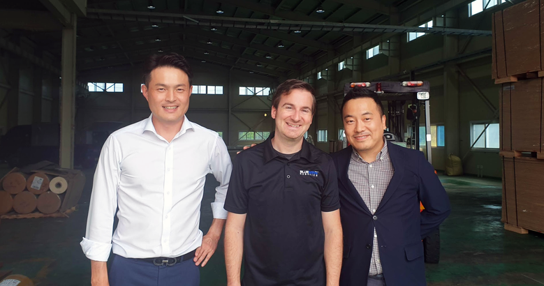 | ▲웨어하우징 플랫폼 첫 외국 고객인 미국기업 Bluewave Robotics CEO가 인천 석남동 창고에서 최병록 공동대표(좌)와 박범진 공동대표(우)와 함께 자리를 기념하고 있다.<사진제공=(주)리코어> |