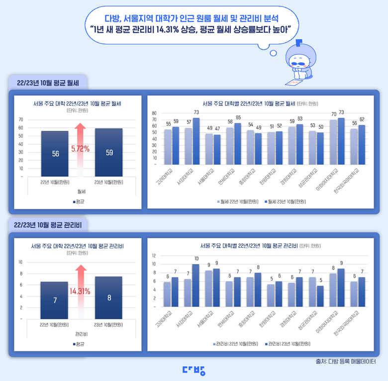 서울대학교 인근 지역의 평균 관리비는 작년과 올해 모두 9만 원으로 동일했으며, 유일하게 성균관대학교 인근 지역이 7만 원에서 5만 원으로 하락했다.