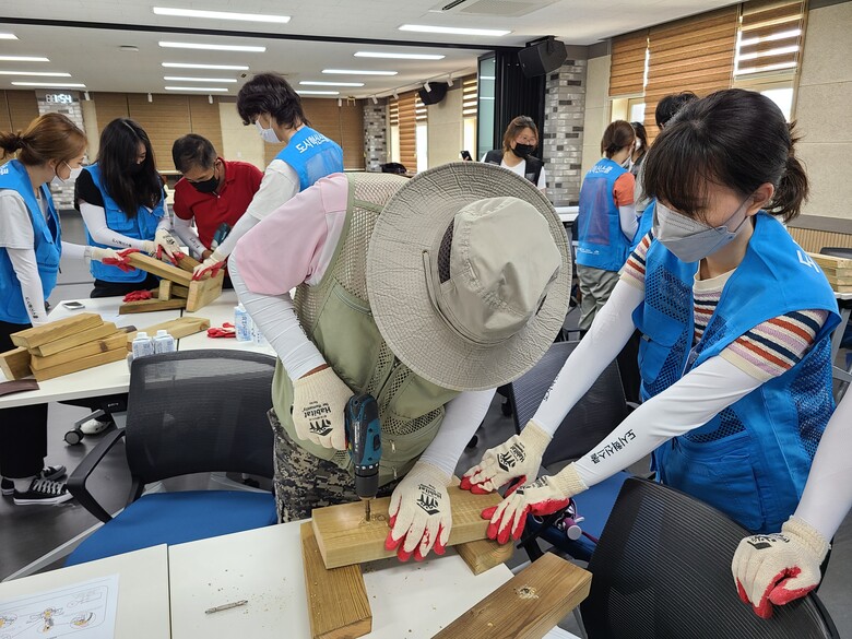 | ▲도시재생프로젝트에 참여한 대학생들이 마을 주민과 함께 직접 의자를 제작하는 모습<사진제공=포스코 건설> |