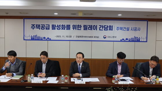 | ▲김오진 국토교통부 제1차관(가운데)이 10일 오후 서울 강남구 건설회관에서 주택건설 시공사를 대상으로 릴레이 소통 간담회'를 진행하는 모습. 사진=국토부 제공 |