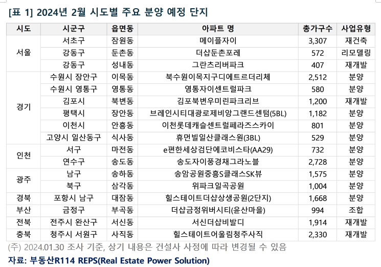 3, 4월 봄 분양 성수기와 맞물린 대형 이벤트(청약홈 개편, 총선)들로 건설사들의 분양 일정 조정이 불가피해졌다. 부동산 PF 부실 문제에 따른 중소 건설사 부도 우려도 확산되고 있어 지역 및 단지별 청약심리에 부정적인 영향을 미칠 수 있다. 2월에도 시장 위축에 따른 공급 속도 조절이 계속되는 가운데, 자금력이 있는 대형 건설사 브랜드 단지와 시세 대비 저렴한 분양가 상한제 적용 단지 위주의 수요 쏠림이 예상된다.