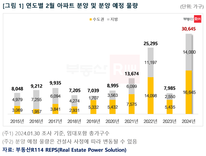 부동산R114(www.r114.com)에 따르면 2월에는 전국에서 36개 단지, 총 3만645가구(임대 포함 총 가구수)가 분양에 나선다. 2000년 조사 이래 동월 기준 역대 최다 물량이 예정돼 있다. 다만 3월 청약홈 개편과 4월 총선으로 2월에 서둘러 분양 일정에 돌입하는 단지와 총선 이후로 일정을 미루는 단지가 있을 수 있어, 예정 물량이 전부 실적으로 이어질 지는 지켜볼 필요가 있다.