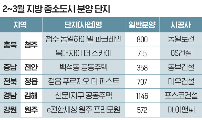 부동산시장 분석업체 부동산인포에 따르면 2~3월 지방 중소도시에서 5605가구가 일반분양 예정인 것으로 나타났다. 지역별로 충북 2550가구, 충남 630가구, 전북 707가구, 경남 1146가구, 강원 572가구다.
