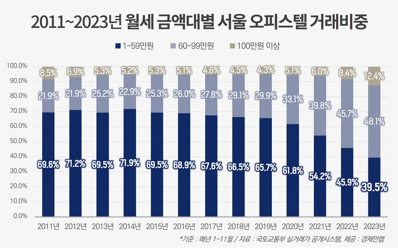 부동산 정보제공 업체 경제만랩이 국토교통부의 실거래가 공개시스템을 살펴본 결과, 2023년 1~11월 서울 오피스텔 월세 거래량은 3만 6068건으로 집계됐다. 이 중 월세 가격이 1~59만원 거래량은 1만 4234건으로 월세 전체 거래의 39.5% 비중을 차지했다. 이는 국토교통부가 관련 통계를 집계하기 시작한 2011년(1~11월 기준) 이후 가장 낮은 비중이다.