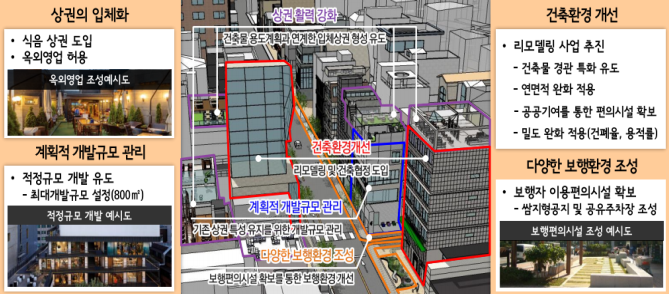 또 높은 임대료로, 가로수길을 떠난 식음료 업종의 활성화를 위해 건축물에 용적률 인센티브도 주기로 했다. 2020년 개정한 법을 적용해 옥상(옥외) 영업이 가능한 식음료 업종을 건축협정 및 리모델링 사업을 통해 최상층에 도입할 경우 용적률 인센티브를 제공해 상권의 다양화를 유도하기로 했다.
