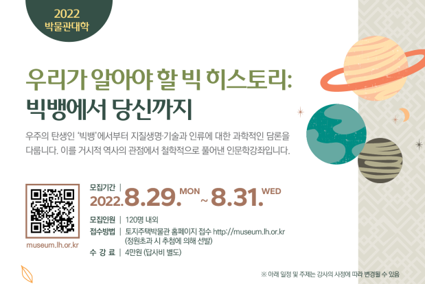 LH 토지주택박물관대학은 LH 토지주택박물관의 대표적인 사회교육 프로그램이다. 이번에는 인문학 일반 강의로 마련됐다. '우리가 알아야 할 빅 히스토리, 빅뱅에서 당신까지'라는 주제로 우주의 탄생부터 지질생명.기술과 인류에 대한 과학적인 담론과 철학을 다룬다.