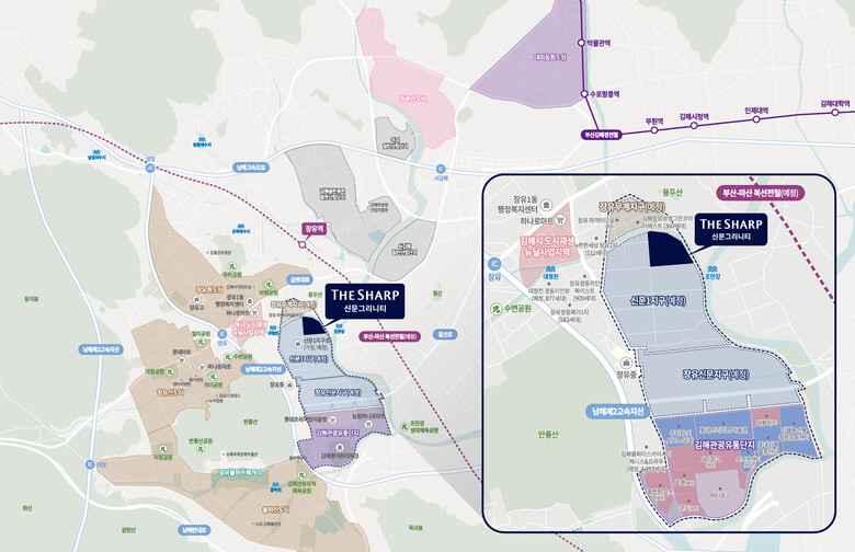 단지가 들어서는 신문1지구는 대도시인 부산과 창원을 잇는 광역권 교통 요충지다. 차량 이용 시 남해고속도로 제2지선과 제3지선 및 장유IC, 서김해IC, 창원1·2터널, 58번 국도 등을 통해 창원 성산구와 부산서구 등 인접 주요 도시로 이동이 수월하다.