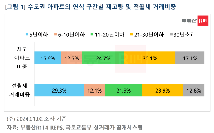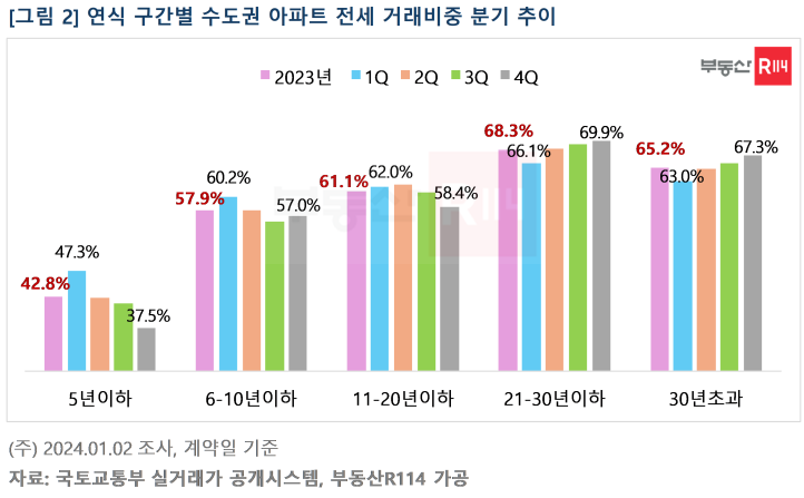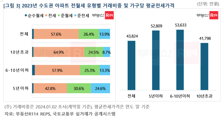 2023년 말 기준, 수도권 아파트 가구당 평균 전세가격을 연식 구간별로 보면 △5년 이하 5억2,809만원 △6-10년 이하 5억3,633만원 △10년 초과 4억1,798만원으로, 5년 이하와 10년 초과 사이에는 1억원 이상 가격 갭이 있다. 그렇다 보니 신축 아파트는 구축에 비해 보증금 일부를 월 차임으로 전환한 ‘준월세(1년치 월세<보증금<=2년치 월세)’, ‘준전세(보증금>2년치 월세)’의 비중이 상대적으로 크다. 지난해 5년 이하 수도권 아파트 전월세 거래 가운데 준월세와 준전세 비중은 각각 30.6%, 24.6%로, 10년 초과(준월세 24.5%, 준전세 8.7%)에 비해 높았다.